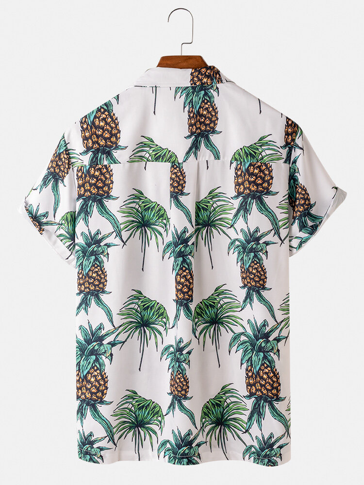 Casual Pineapple Plant Print Chest Pocket Mens White Short Sleeve Shirts – White S