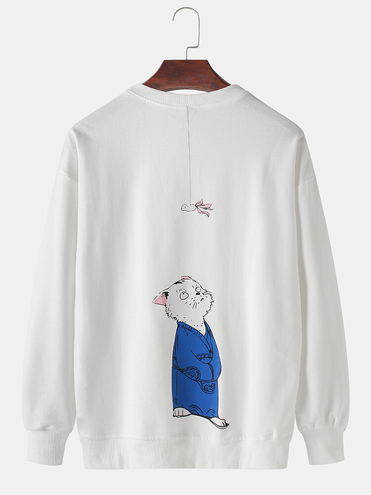 Cat Back Print Drop Shoulder Mens Cotton Long Sleeve Cartoon Sweatshirts – Black L
