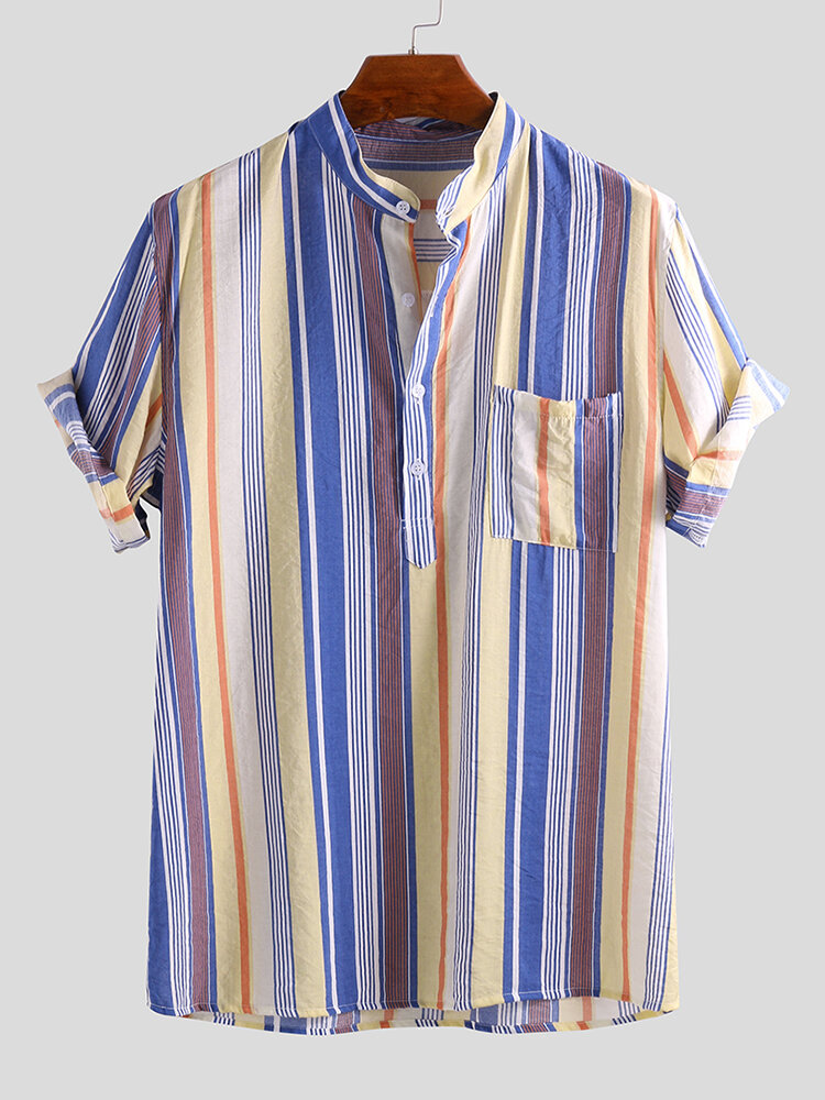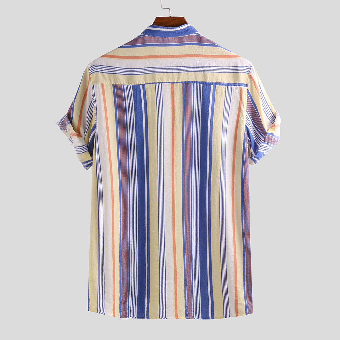 : CharmkprSleeve Length: Short SleeveItem Type: ShirtsPattern Type: StripeGender: MenFit Type: LooseStyle: Casual, Hawaiian Style, Home, LeisureThickness: ThinCollar: Stand CollarSeason: Spring, SummerMaterial: 100% RayonOccasion: Leisure, Homedress, Beach, Traveling