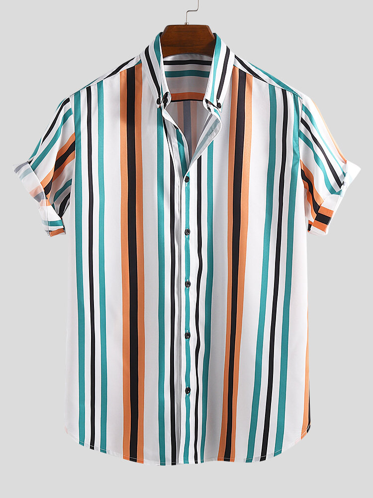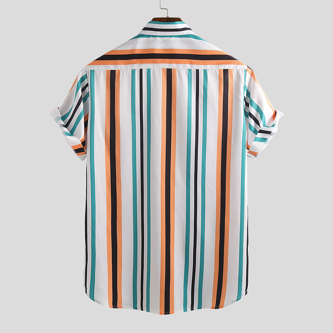 Item Type: ShirtsPattern Type: StripeGender: MenFit Type: LooseStyle: CasualThickness: ThinCollar: Turn-down CollarSeason: Spring, SummerMaterial: PolyesterOccasion: Leisure, Homedress, BeachSleeve Length: Short Sleeve