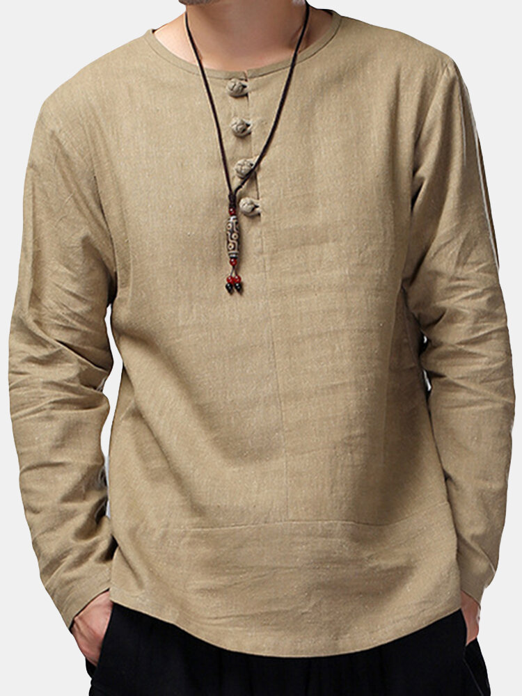 Brand Name: CharmkprPattern Type: Solid ColorItem Type: T-shirtsFit Type: LooseGender: MenThickness: ThinStyle: Chinese Style, Casual, VintageSeason: Spring, AutumnCollar: O-neckWeight: 0.3kgMaterial: 80%Cotton+20%LinenColor: White, Khaki, NavyCuff Type: Straight SleevesOccasion: Leisure, HomedressSleeve Length: Long Sleeve