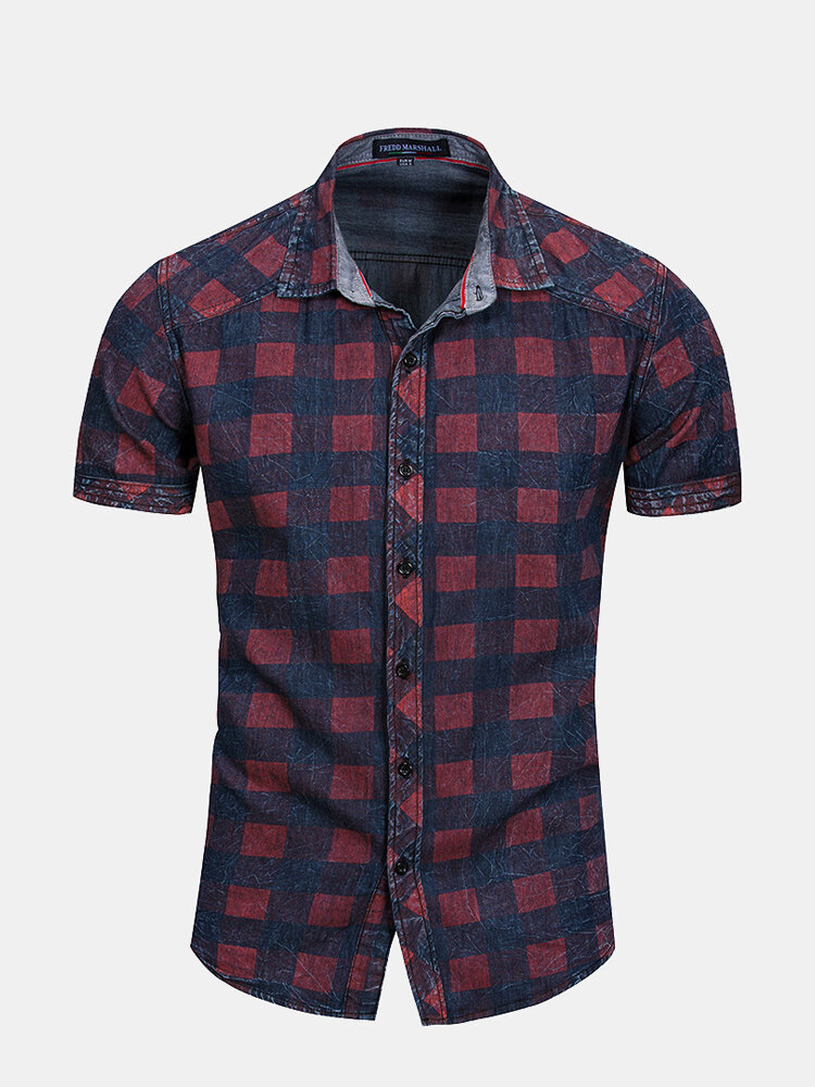 Item Type: ShirtsPattern Type: GeometricGender: MenFit Type: FitStyle: Casual, WorkThickness: RegularCollar: Turn-down CollarSeason: SummerMaterial: 100% CottonWeight: 0.3kgCuff Type: Straight SleevesColor: Blue, RedSleeve Length: Short SleeveOccasion: Casual