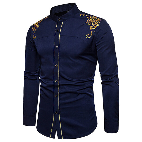 Chic Euramerica Palace Style Embroidery Slim Fit Band Collar Shirts for Men – S White