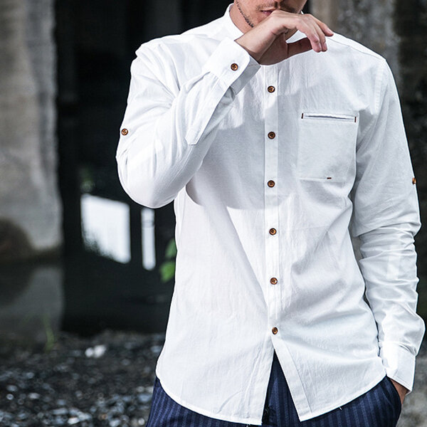 Chinese Style Cotton Linen Spring Fall Pure Color Men Casual Shirt – S Navy Blue