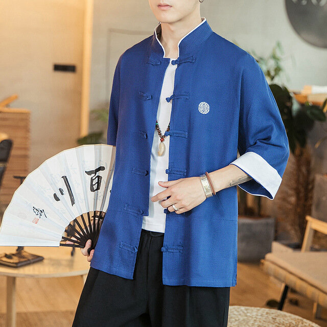 Chinese Style Shirt Male Loose Kimono Retro Cotton And Linen Seven-point Sleeves National Tide Black Robe Short-sleeved Shirt Jacket Tide – 5XL China