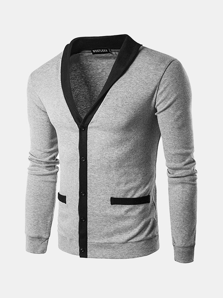 Classic Brief Fashion Neckline Sweatershirt Men’s Single-breasted Hit Color Knitting Cardigan – 2XL Wine Red