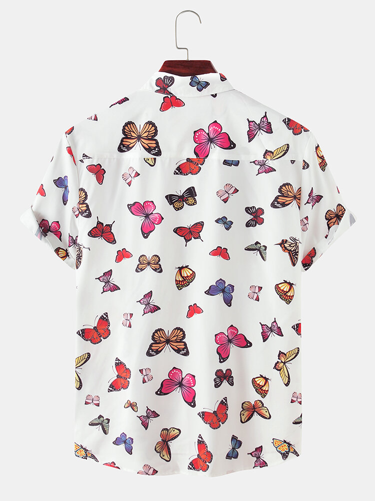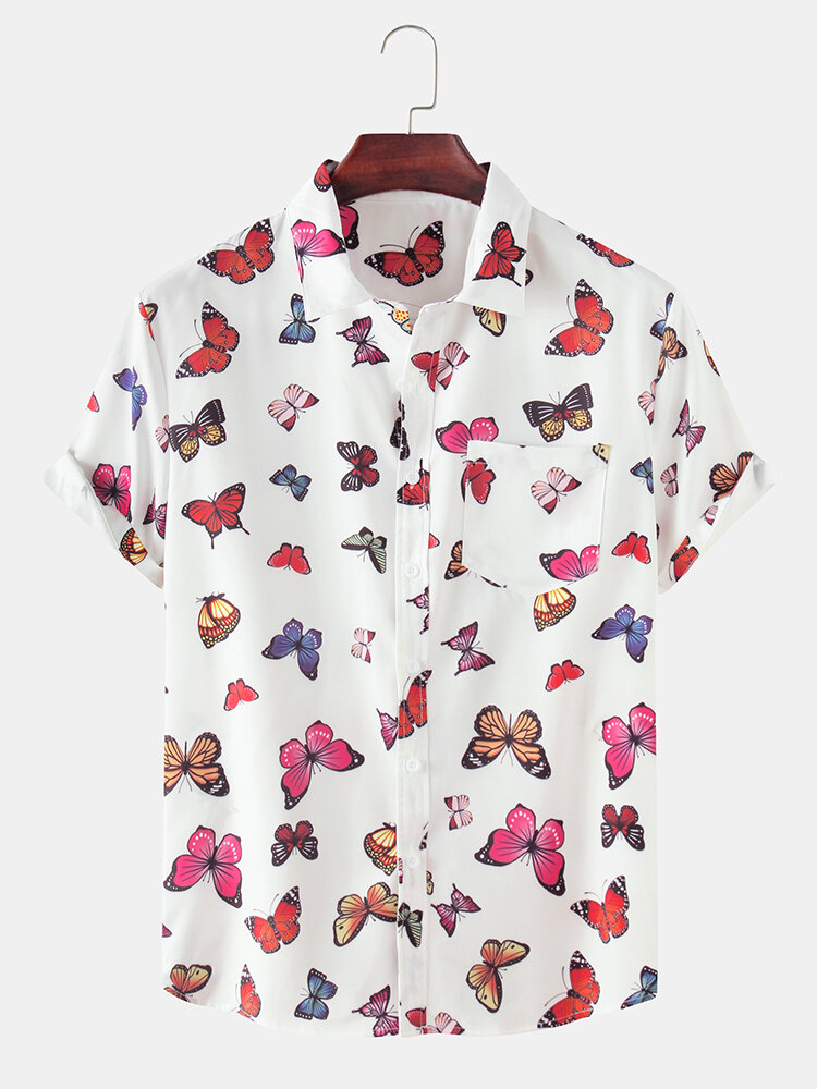 Colorful Butterfly Print Chest Pocket Short Sleeve Beach Holiday Casual Shirts – White M