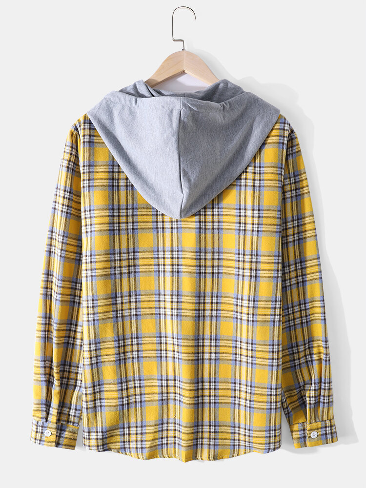 Colorful Plaid Print Chest Pocket Long Sleeve Cotton Hooded Shirts For Men – S Green