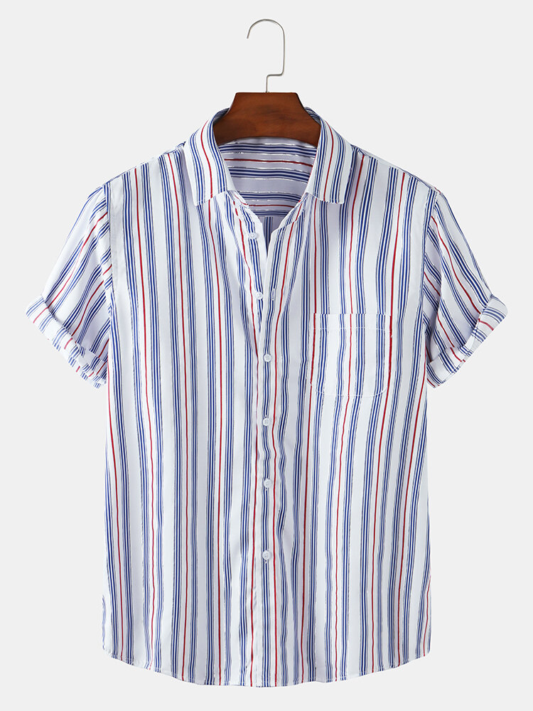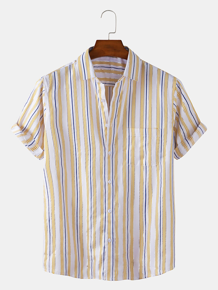 Description:Decoration:PocketFit Type:Regular FitMaterial:PolyesterNeckline:LapelPattern Type:StripedScene:Leisure,Home,Beach,CasualSeason:SummerSize:XXL,L,S,XL,MSleeve:Short SleeveStyle:Casual,Hawaii Style