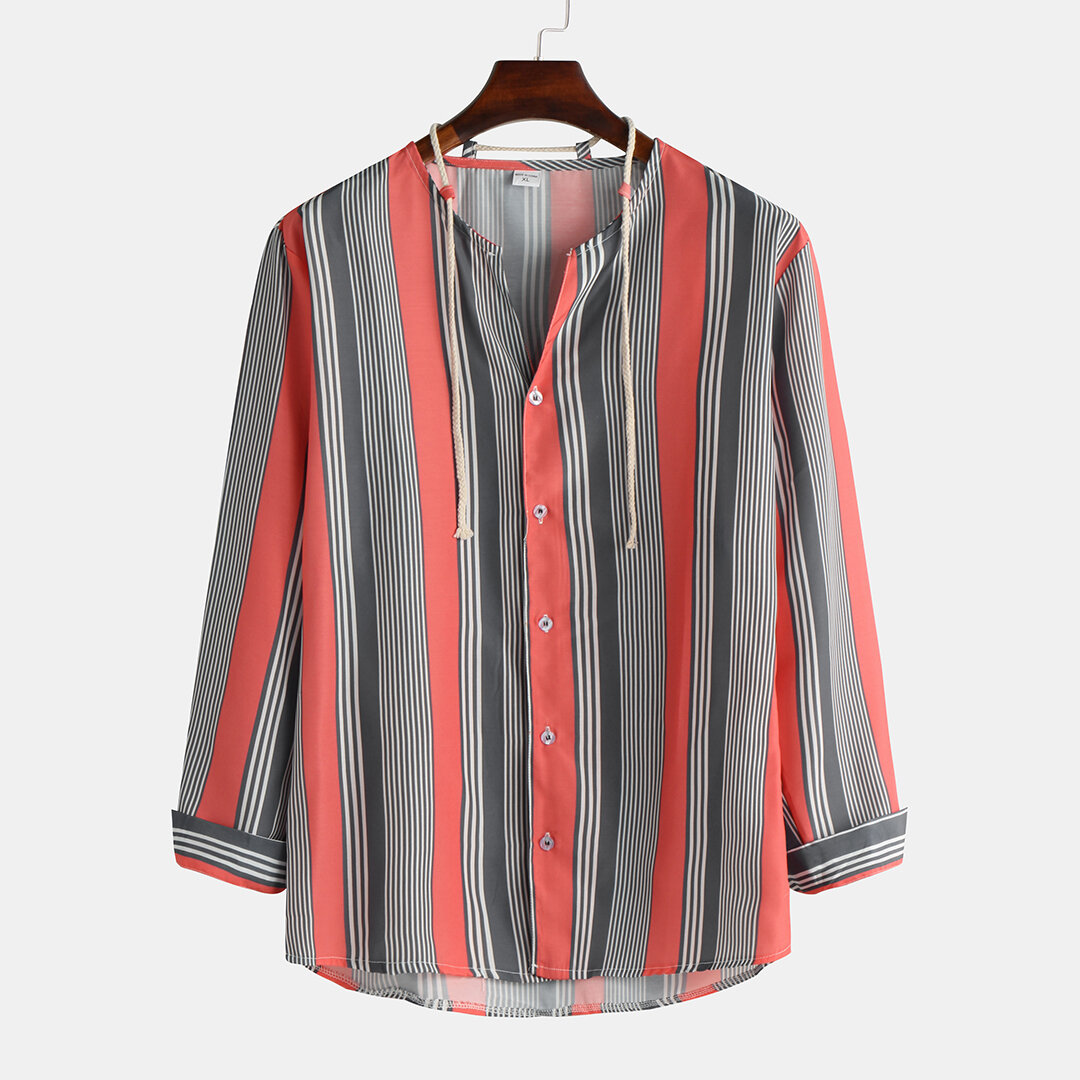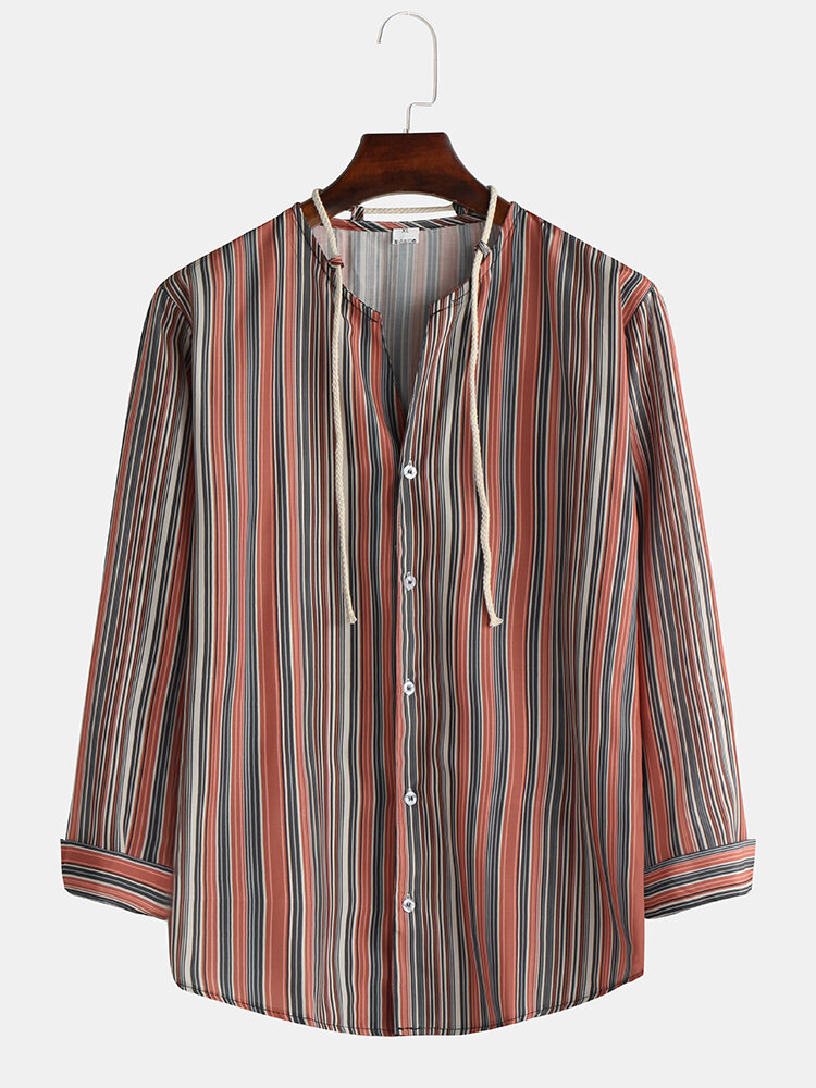 Colorful Stripe Fashion Drawstring Long Sleeve Casual Shirts – L Red