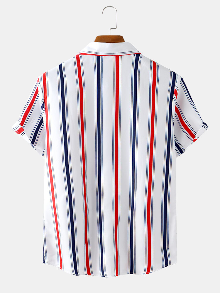 Colorful Vertical Stripes Lapel Collar Mens Short Sleeve Holiday Casual Shirts – Black S