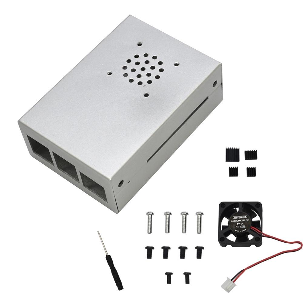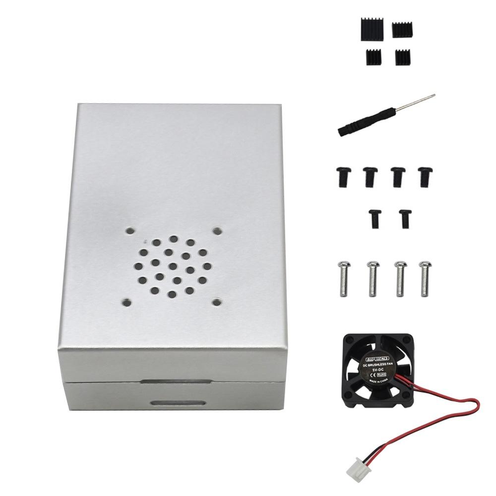 Coque metallique de protection en alliage d’aluminium avec boetier metallique + dissipateur de chaleur noir / ruban + ventilateur pour kit de refroidissement pour Raspberry Pi 4 – Argente