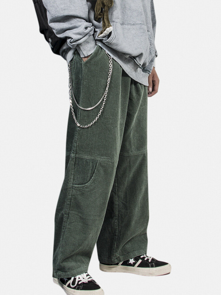 Corduroy Mens Drawstring Multi Pocket Solid Color Loose Pants – Green 2XL