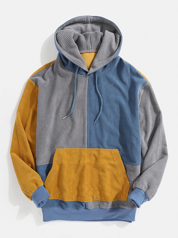 Corduroy Mens Patchwork Long Sleeve Design Hoodies With Kangaroo Pocket – Blue S