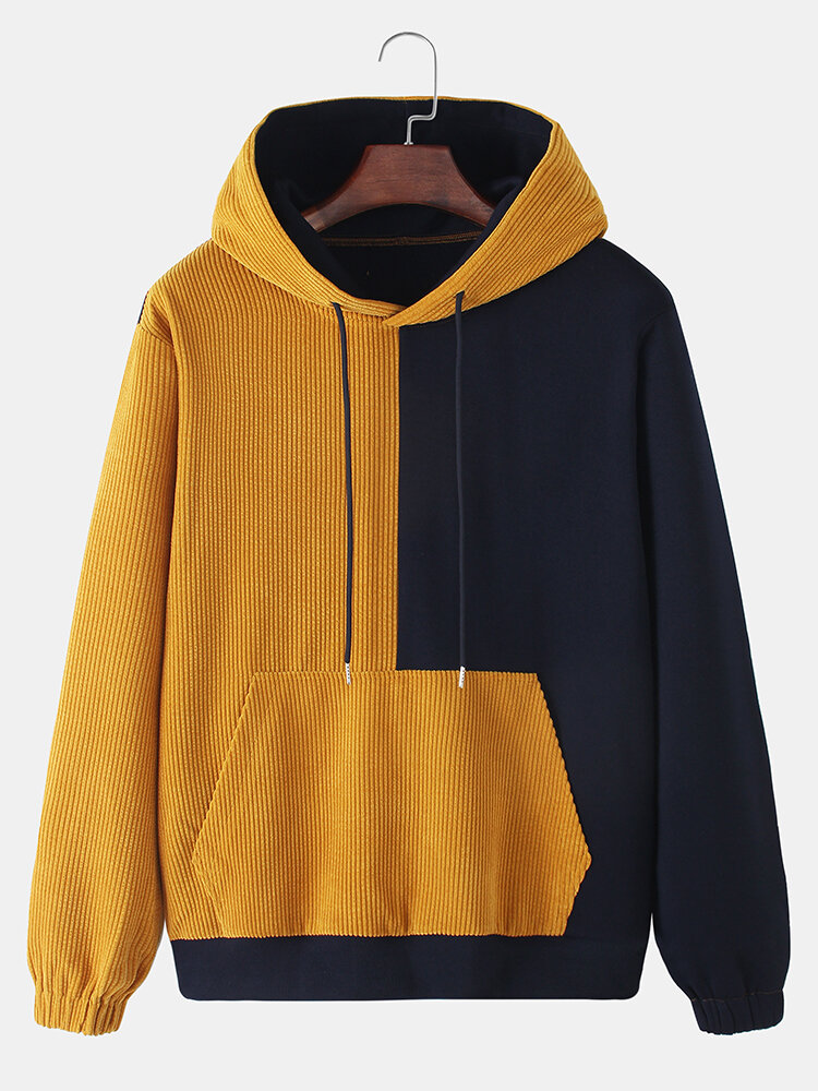 Corduroy Mens Solid Color Patchwork Kangaroo Pocket Casual Drawstring Hoodie – Brown S