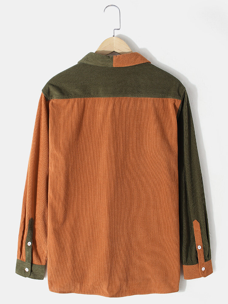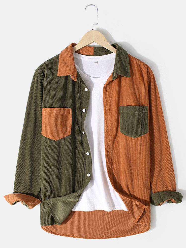Corduroy Stitching Design Double Pocket Button Up Long Sleeve Shirts For Men – Orange S
