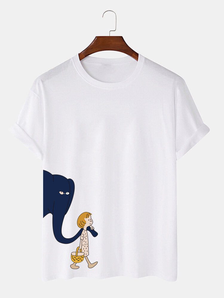 Cotton Cartoon Girl Holding Elephant Print Short Sleeve T-Shirts – Khaki S