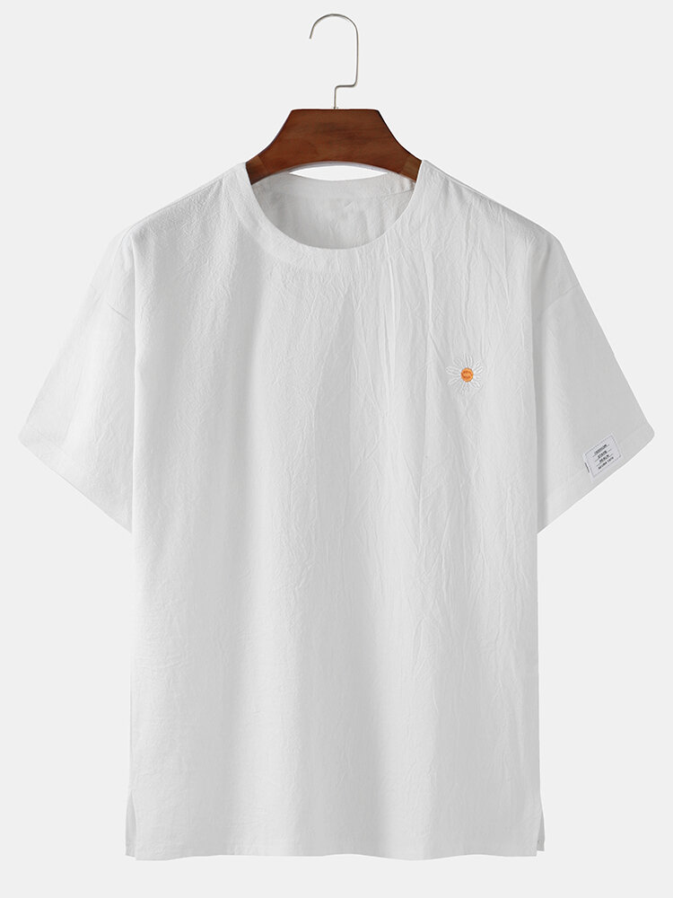 Cotton Daisy Embroidery Simple Round Neck Short Sleeve Casual T-Shirts – White M
