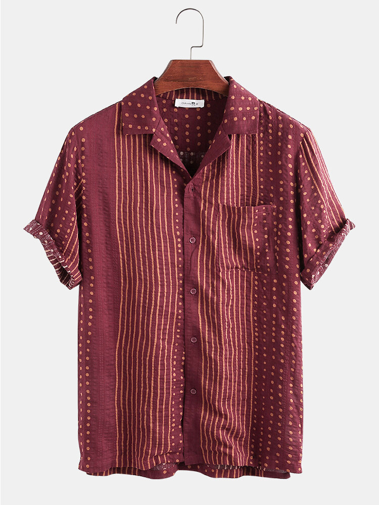 Cotton Ethnic Stripe Polka Dot Print Chest Pocket Revere Shirts – Red M