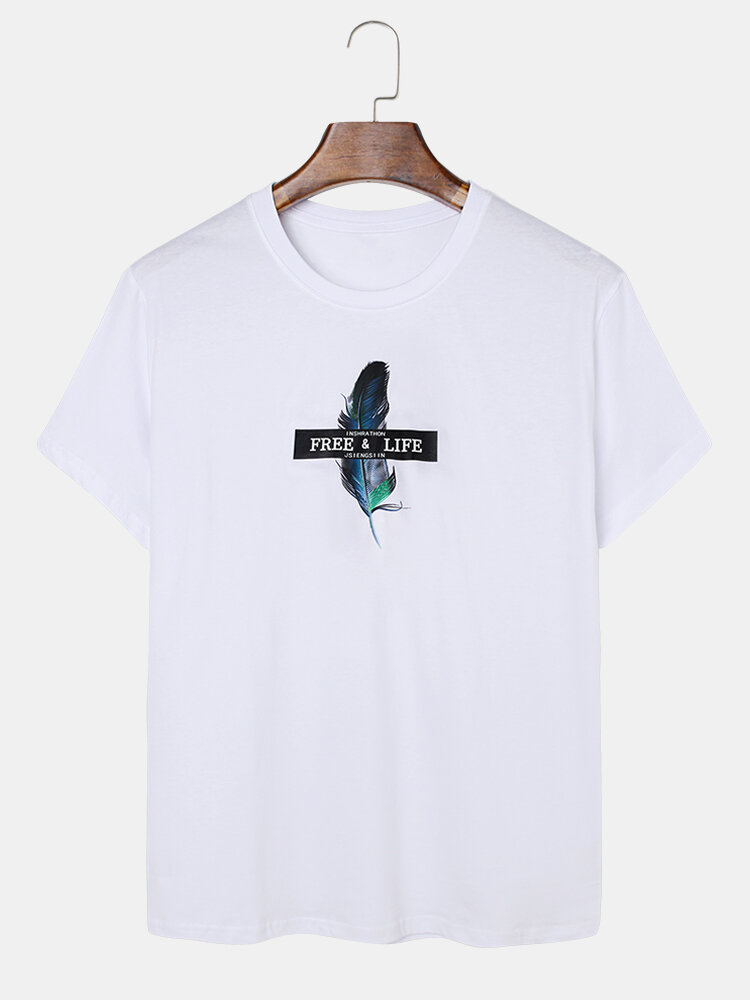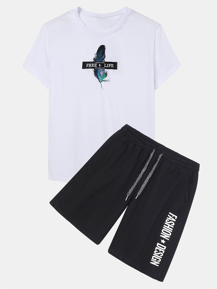 Cotton Men Feather Letter Print Short Sleeve Top Drawstring Two Piece Sport Suits – White M