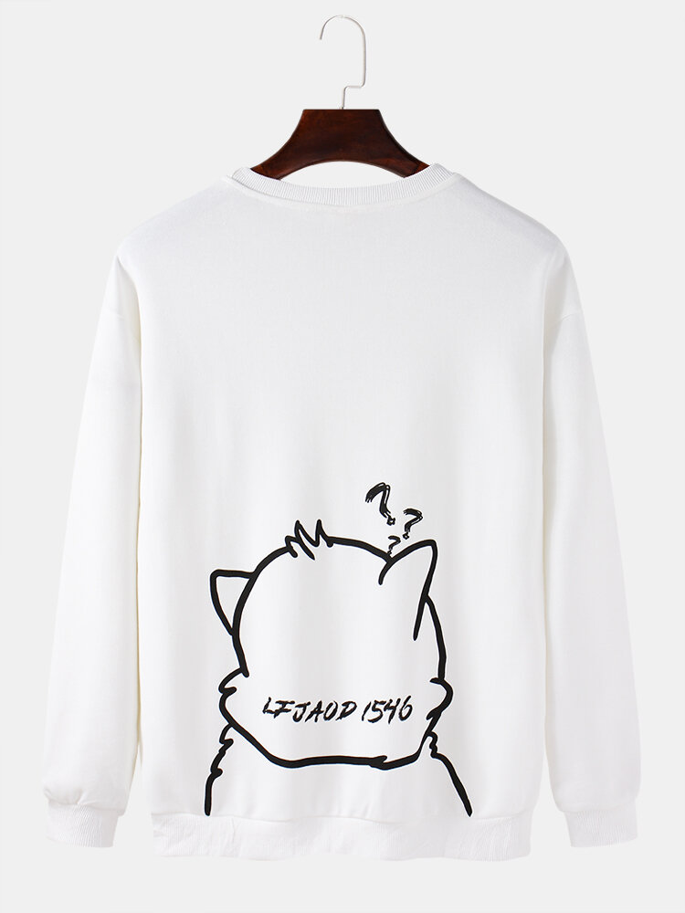 Cotton Mens Cartoon Cat Pattern Pullover Drop Shoulder Simple Long Sleeve Sweatshirts – Black XL
