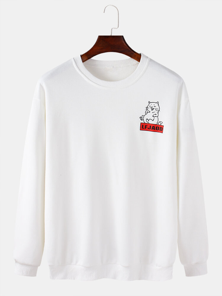 Cotton Mens Cartoon Cat Pattern Pullover Drop Shoulder Simple Long Sleeve Sweatshirts – Black XL