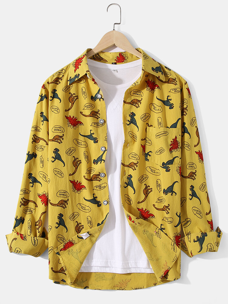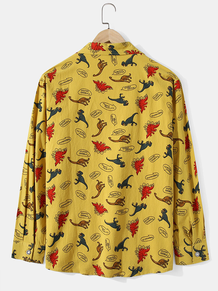 Cotton Mens Cartoon Dinosaur & Letter Print Lapel Long Sleeve Funny Shirts – White S