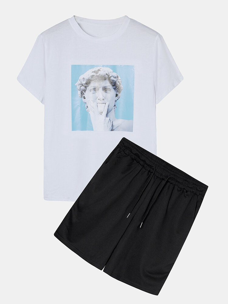 Cotton Mens Plaster Statue Print Drawstring Short Sleeve Loose Two Piece Outfits – White S