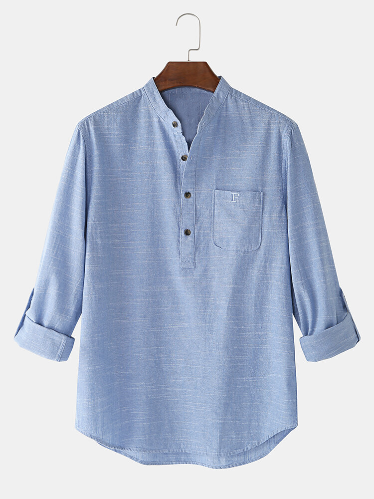 Cotton Mens Solid Color Stand Collar Breathable Long Sleeve Henley Shirts – White L