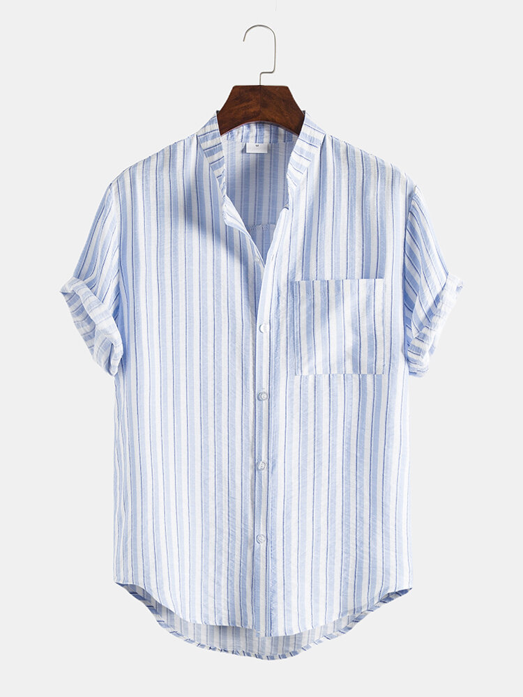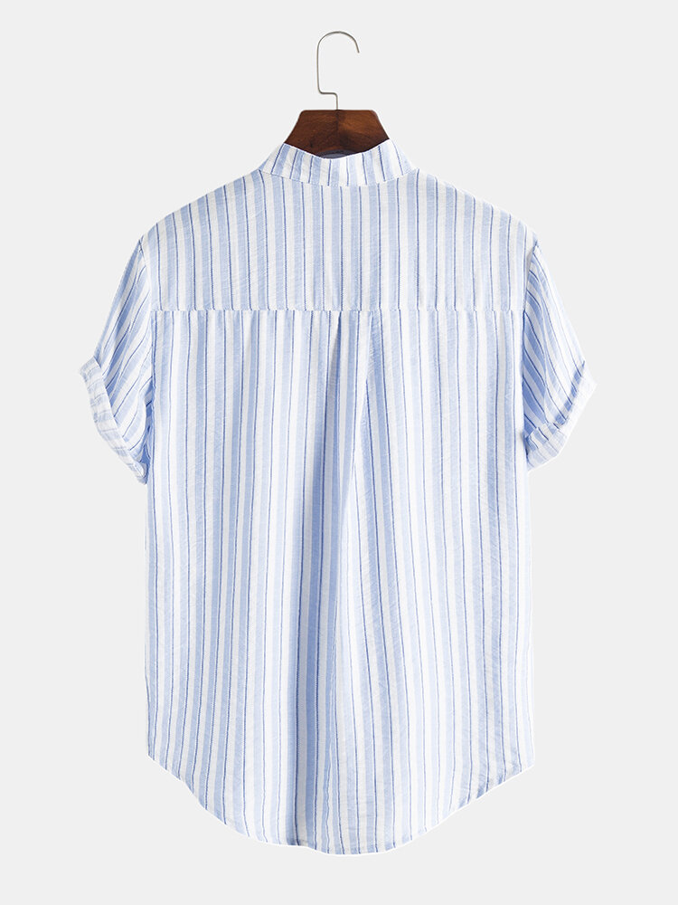 Cotton Mens Vertical Stripes Stand Collar Chest Pocket Short Sleeve Holiday Casual Shirts – Blue S
