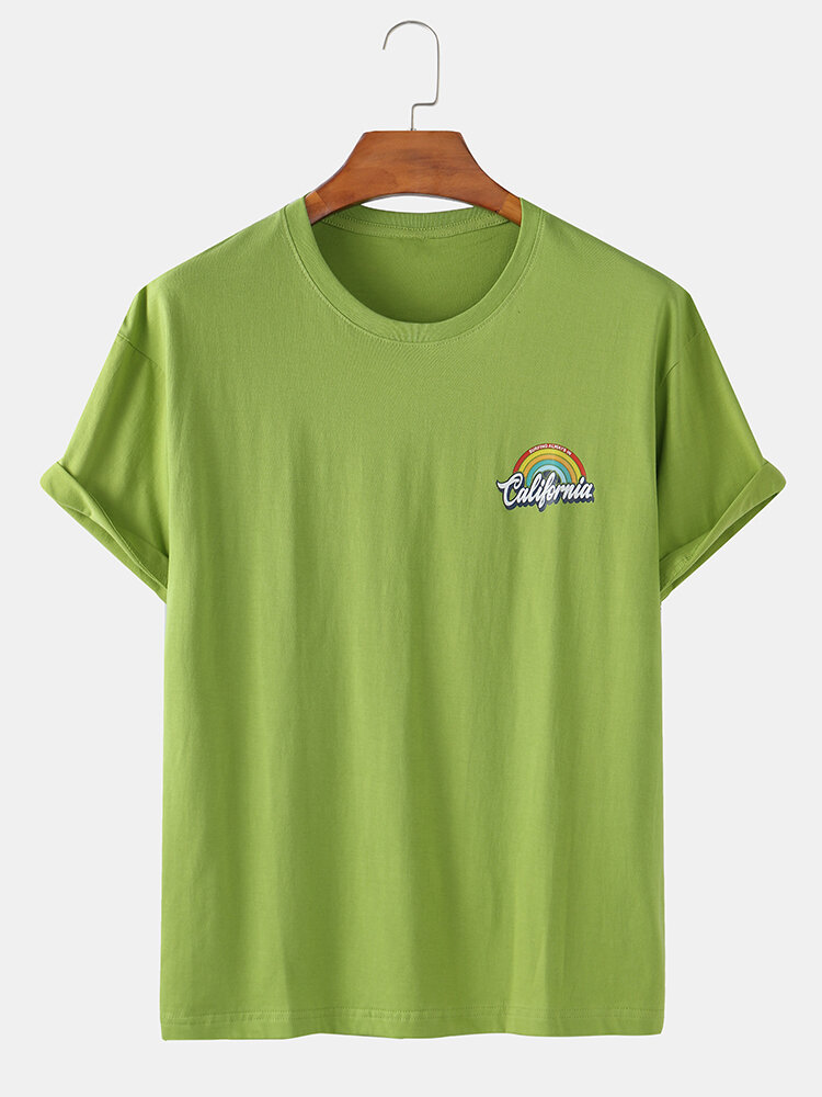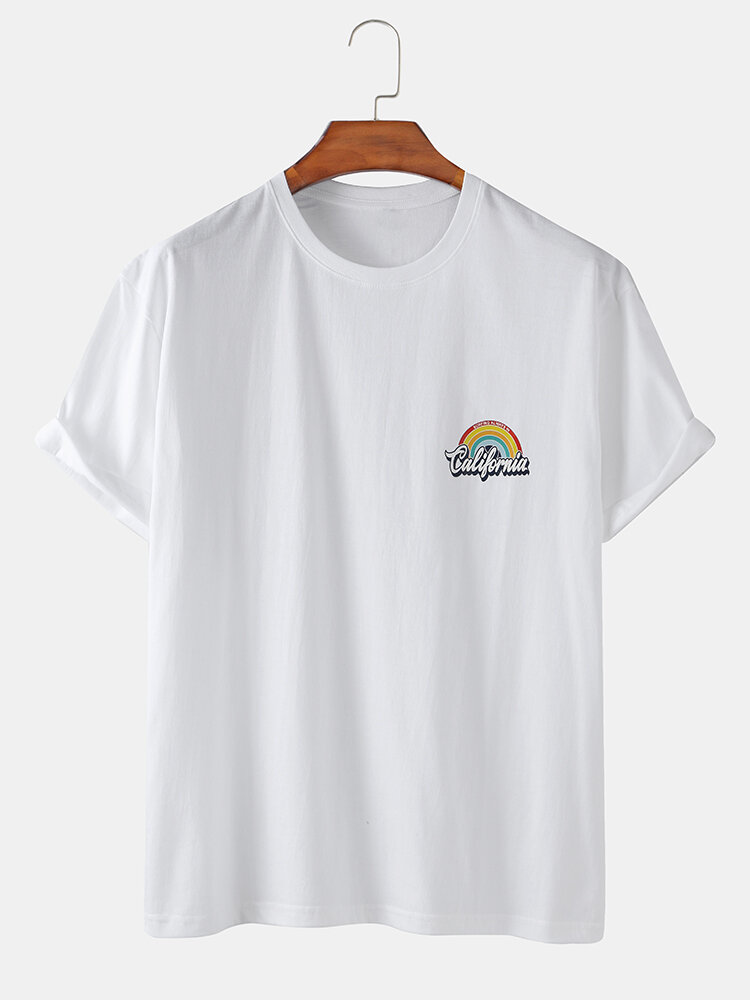 Cotton Rainbow Pattern Text Print Short Sleeve Casual T-Shirts – White M