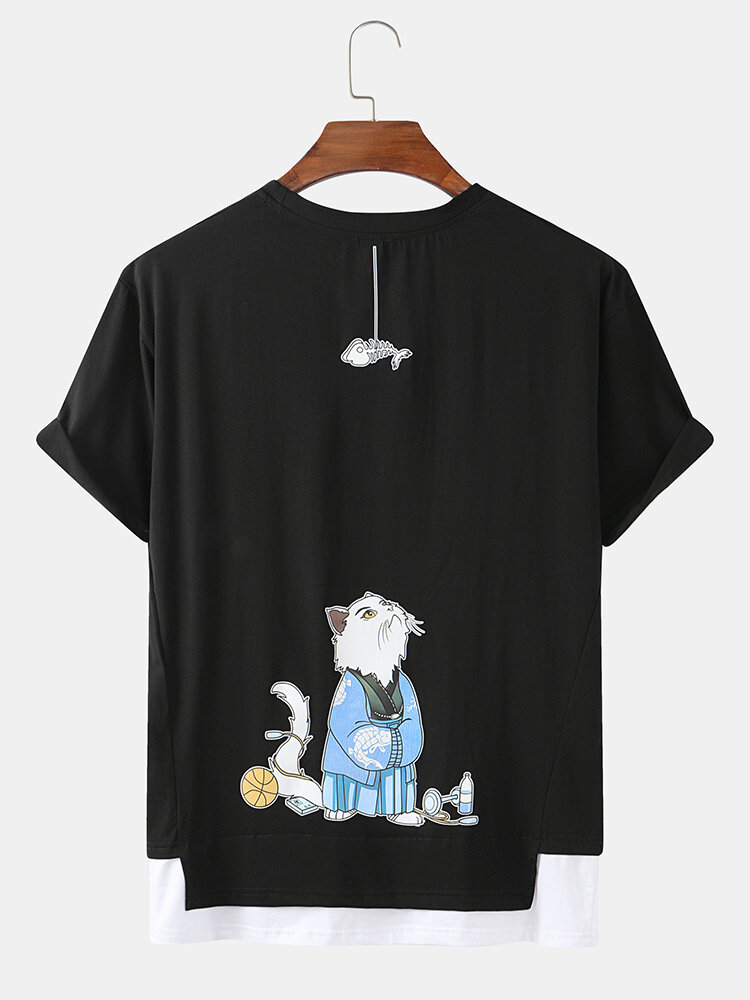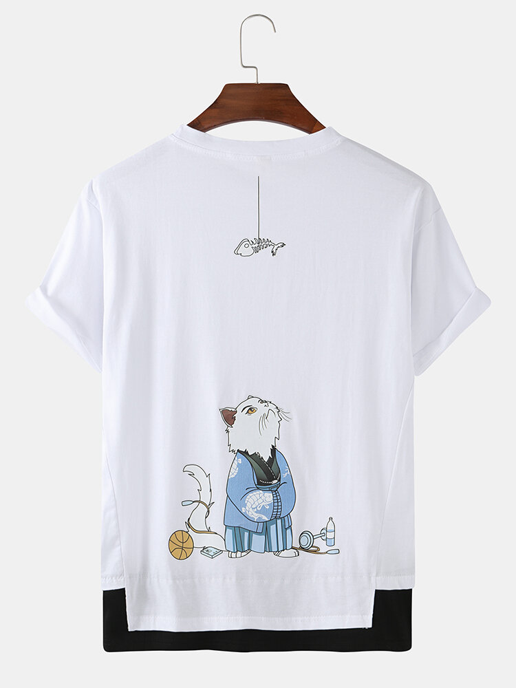 Cute Cartoon Cat Back Print Cotton Round Neck Short Sleeve Loose T-Shirts – White L