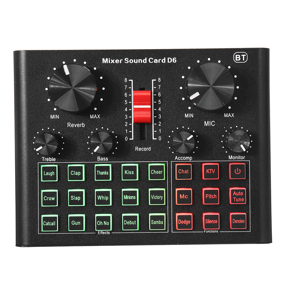D6 sound card:Built-in 15 independent live sound effects and 8 voice effectsAll kinds of interesting sound effects, with one-button switch, it's easy to ignite the atmosphere while liveDual DSP sound beautification provides more silent environment with professional sound pick up and intelligent noise reduction and more effectively filter environmental noiseProvides multiple functions. Including many input portsVolume control, reverb control, accompaniment, treble control, bass control, as well as recording and plug and play, easy to operateCan connect with two microphones, two mobile phones, headset, headphone, accompaniment and PC, and supports BT connectionWith compact sizeExquisite appearance and dazzling colorful Silicone button, a perfect choice for live streaming, broadcast, gaming, karaoke and so onCharging port: USBBattery: 780mABluetooth version: 5.0Material: Metal and plasticSize: 13 x 10 x 2CMPackage Weight: 450g / 15.8ozBM800 microphone:Model: BM800Gross weight: 0.8kgFrequency: 20Hz-20kHzCurrent: 3mASensitivity: -32db+/-1dbVoltage: 5V-48VSignal to noise ratio: 78dbSound pressure level: 130db