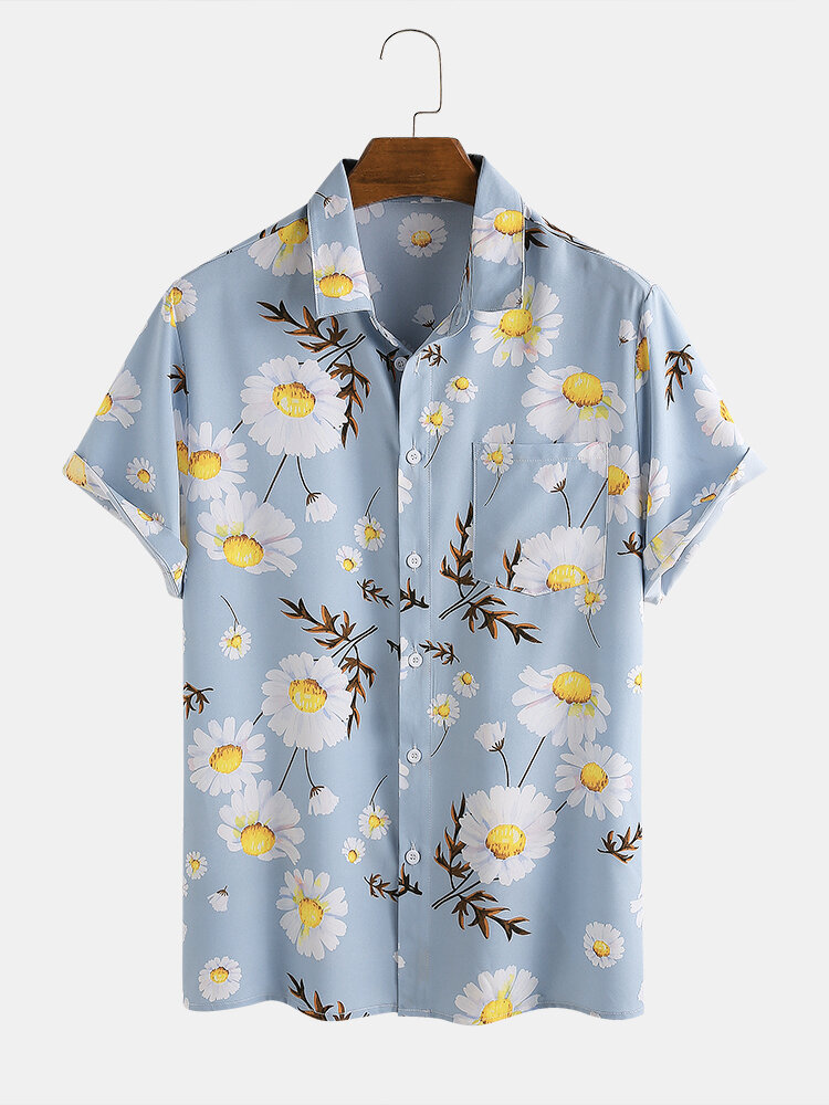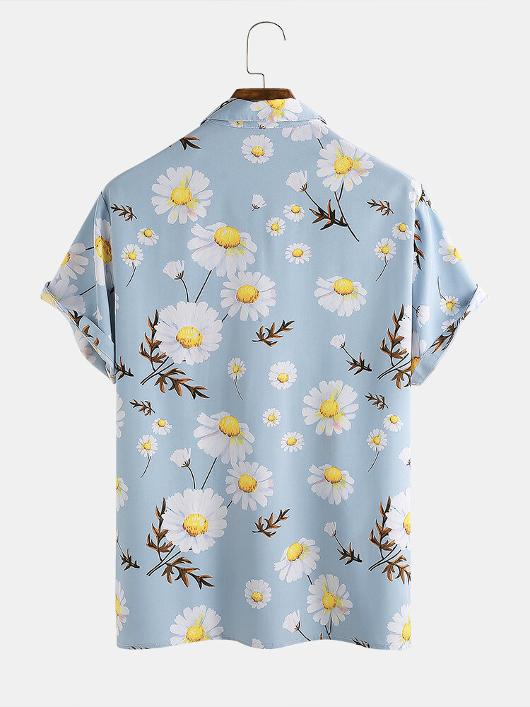 Daisy Floral Printed Turn Down Collar Short Sleeve Hawaii Holiday Shirts For Men Women – Green M