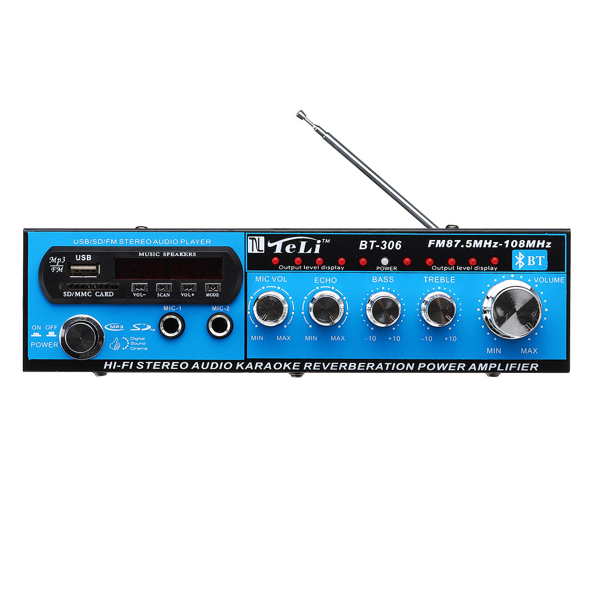 Mini digital bluetooth audio power amplifier.Built-in LCD display, with backlight function.SD/MMC Card, U disk, MP3 format play, support bluetooth wireless connection and AUX-in.Supports FM stereo radio.Two microphone input slot, karaoke system in your home or in car.With treble, bass, and volume control, very easy to use.Two main channel output.With Remote control function.DC/ AC power in, Suitable for home or your car.