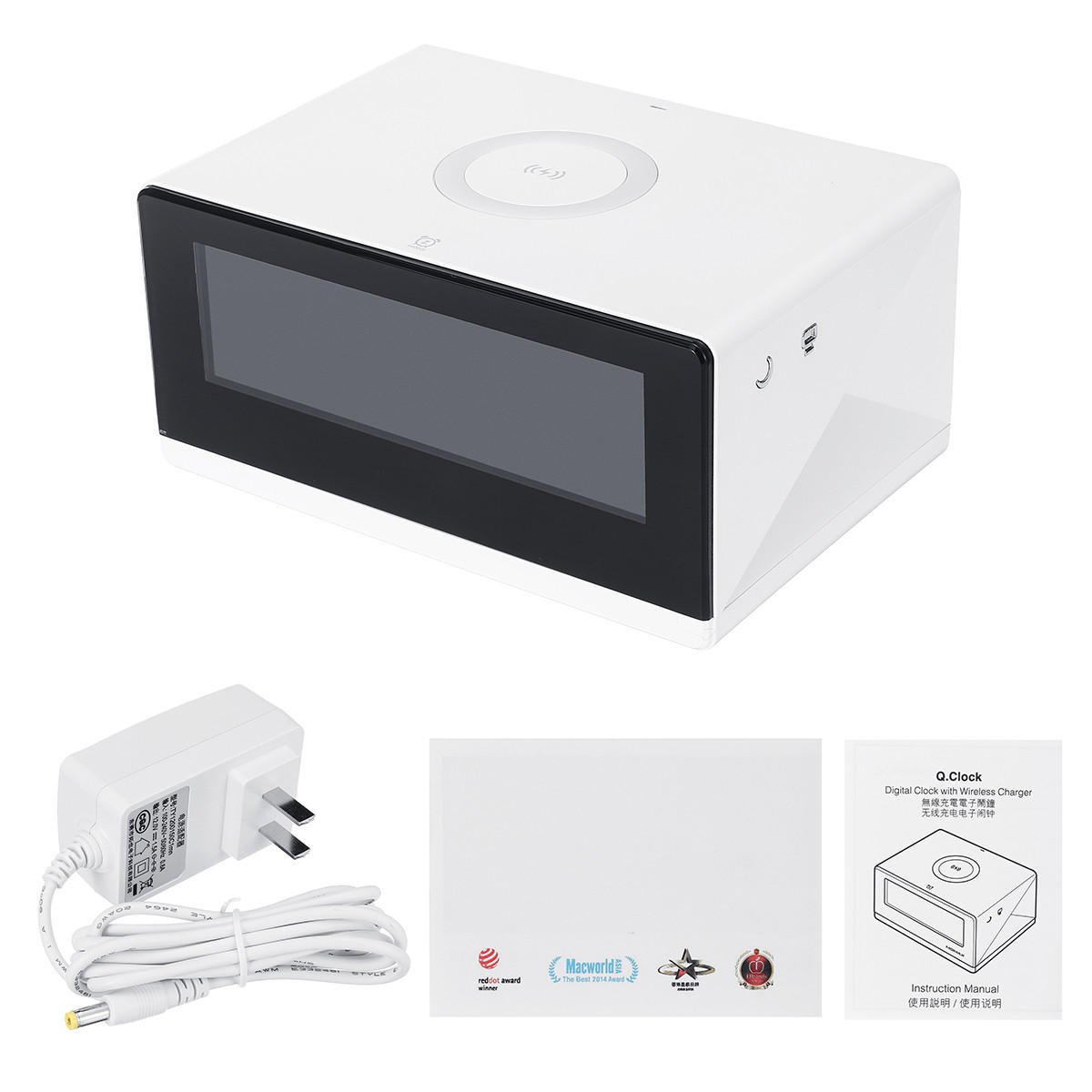 . Caracteristiques: Entree: DC12V 1.5A 50 / 60Hz Puissance: 18W Sortie: 5V 1A, 9V 1A (10W max) sans fil Temperature de couleur: 2800-3200K Puissance lumineuse: 1.5W Batterie: CR2032 batterie (non incluse) Materiel: ABS + Metal Couleur blanche Dimension: 156mmx107mmx80mm Fonctionnalite: -Chargeur sans fil compatible Qi: 10W (pour Android), 7.5W (pour IOS) -Grand LCD ecran negatif AV: heure, date, temperature interieure - Horloge d'alarme avec fonction SNOOZE extensible -Avec protection contre la surchauffe, protection contre les courts-circuits, protection contre les surcharges, protection contre les limites de courant, protection contre les decharges excessives et les surtensions -Dimmable Reglage e 3 niveaux Dimmable LCD diaplay backlid Veilleuse dimmable LED -Charge rapide Chargement sans fil de votre appareil compatible Qi Placez votre appareil compatible Qi, tel qu'un smartphone, au-dessus de Q.Clock. le voyant devient rouge indiquant que la charge est lancee.L'indicateur devient vert indiquant que la charge est en cours. est termine. Retirez votre appareil lorsque le chargement est termine. S'il vous plaet noter: pas inclus le telephone Emballage inclus: 1 x horloge numerique avec chargeur sans fil 1 x adaptateur d'alimentation 1 x manuel de l'utilisateur