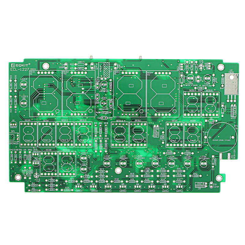 . Instruction de soudage: Cliquez ici pour ouvrir Specification: Nom du kit: Calendrier electronique (Non assemble) Modele de kit: ECL-1227 Tension de fonctionnement: DC9-12V Courant de fonctionnement: =90mA Courant dynamique: =160mA Couleur d'affichage: Rouge / Vert / Bleu (facultatif) Langue du panel: Anglais Taille du produit fini: 228 x 160 x 38mm Poids net: environ 375g Erreur de synchronisation: = e 0,5 seconde / jour Erreur de temperature: = e 1 Caracteristiques du kit: 1. 1 pouce grand temps d'affichage numerique 2. Calendrier d'affichage numerique de 0.5 pouces et temperature 3. Les couleurs d'affichage rouges, vertes et bleues sont facultatives 4. Affichage en temps reel en quelques secondes, en ajoutant dynamique 5. Fonction d'economie d'energie de commutateur de cle unique 6. 50 ans d'affichage du calendrier 7. Affichage de la temperature en temps reel 8. La fonction entiere de belling de temps de point, simulent la cloche d'eglise 9. Reveil 8 voies, rappel d'anniversaire 12 voies 10. 12/24 heure systeme, Celsius / Fahrenheit peut etre change e tout moment 11. Il y a des parentheses et des trous accrochants sur le dos, peuvent etre places sur le bureau ou sur le mur 12. Memoire de mise hors tension, arriere-plan automatique fonctionnant quand l'alimentation est coupee, pas besoin de remettre l'alimentation 13. Peut simuler le son de l'eau courante et des appels de coucou Emballage inclut: 1 x Kit de calendrier electronique Affichage apres assemblage, pour reference seulement , , , , , , , , ,