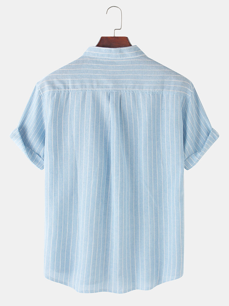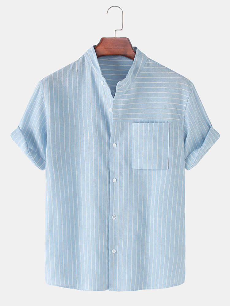 Decoration:PocketFit Type:Regular FitMaterial:CottonNeckline:Stand CollarPattern Type:StripedScene:Leisure,Home,Beach,CasualSeason:SummerSize:XXXL,XXL,L,XL,MSleeve:Short SleeveStyle:Casual,Hawaii Style