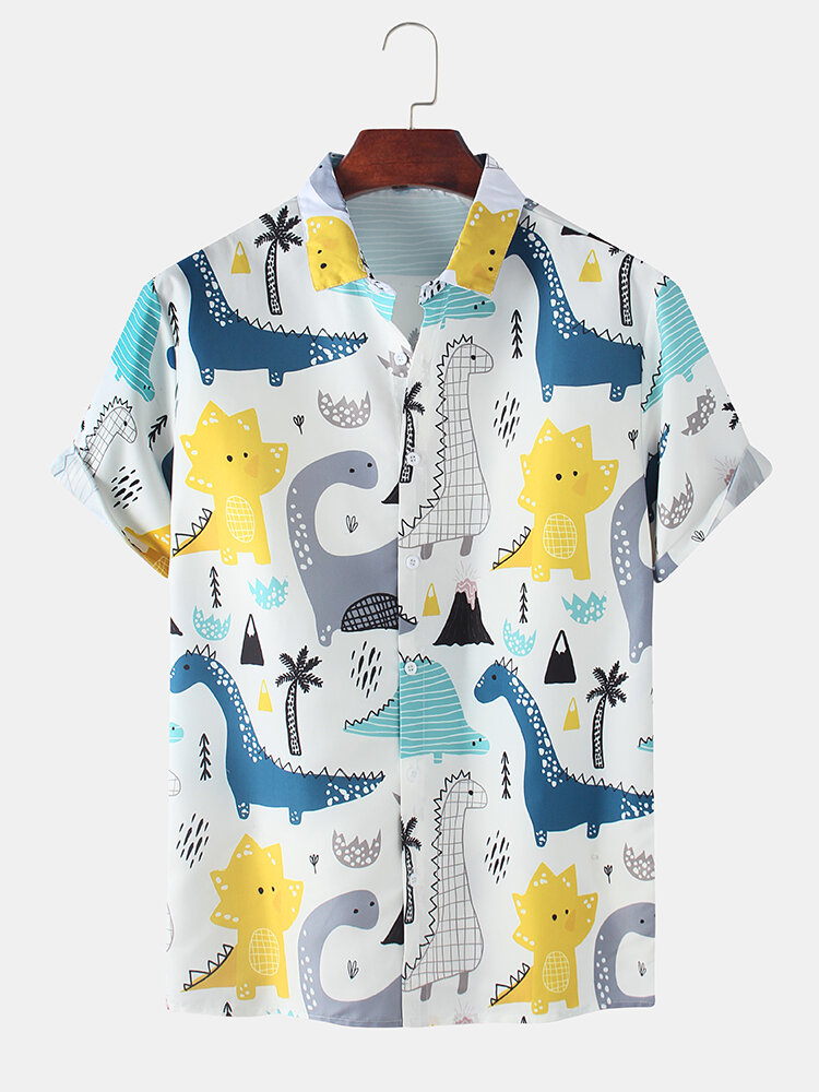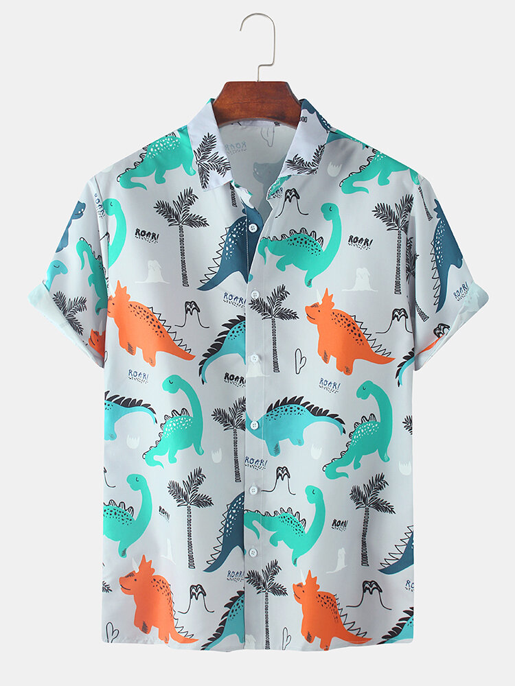 Dinosaur Cartoon Print Turn Down Collar Short Sleeve Shirts For Men Women – Grey M
