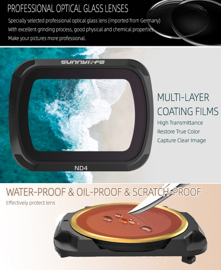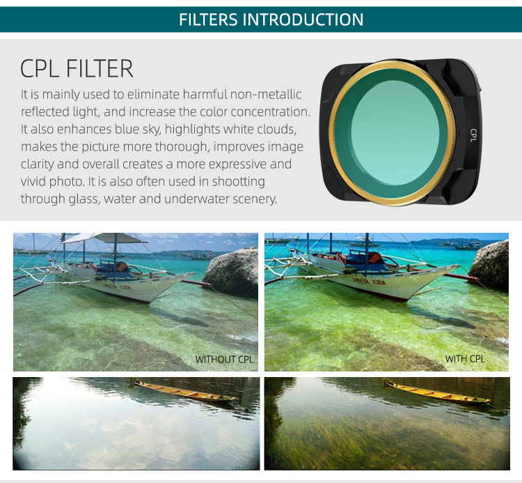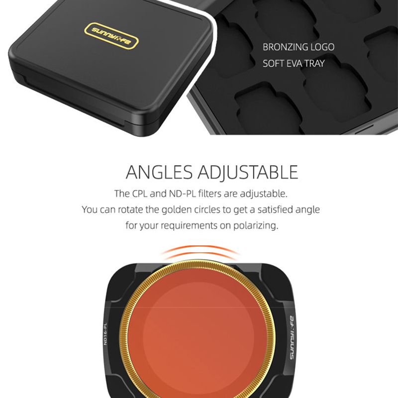 - CPL and ND-PL are adjustable filters, which can rotate the golden frames during shooting to meet the requirements of polarizing.- multi-layer coating filter, high penetration, highlight and restore true color.- choose professional optical glass lenses to make your work more professional.