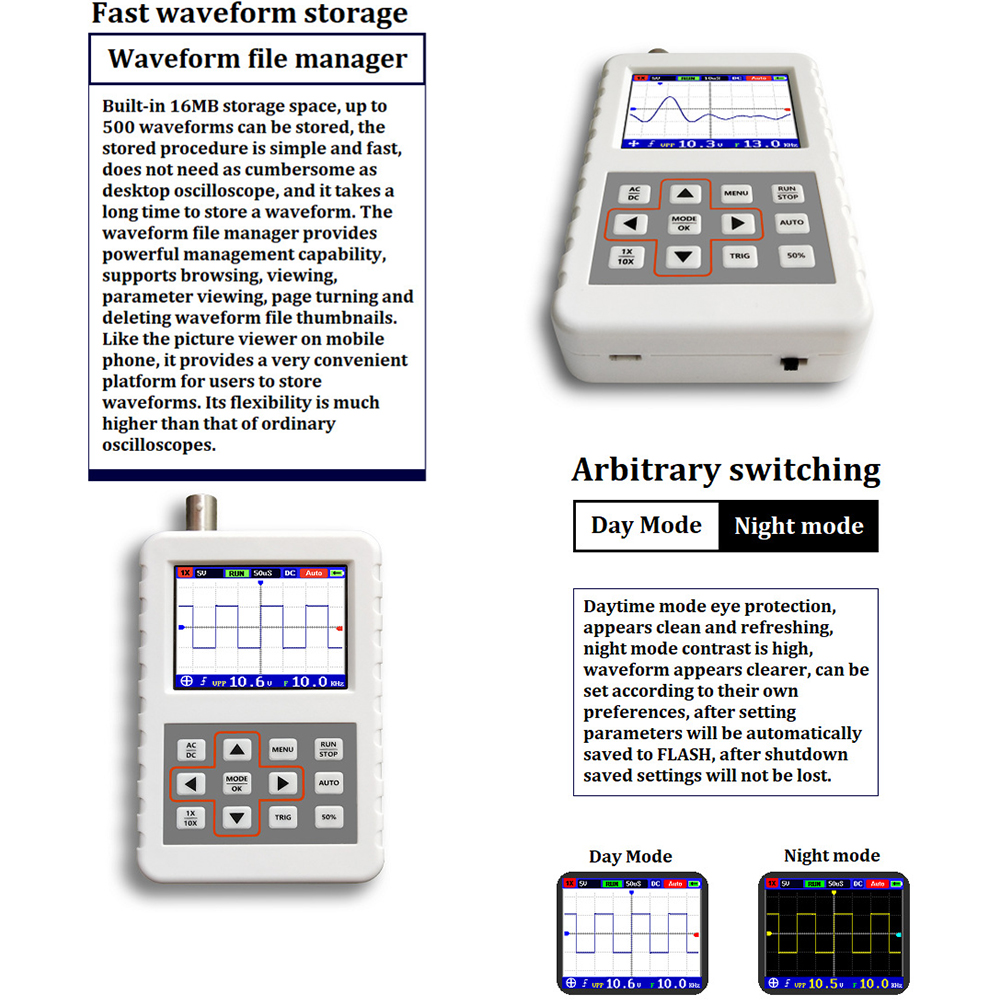 it has a real-time sampling rate of up to 20MS/s and a 5MHz analog bandwidth. Built in 1200mAh rechargeable lithium battery can be continuously charged for 3 hours at one time. Day mode and night mode can be changed according to their own preferences. Powerful waveform file manager, support thumbnail browsing, viewing, details view, flip, delete and other functions. Display the High Definition LCD screen equipped with 2.4 inch 320 x 240 resolution.
