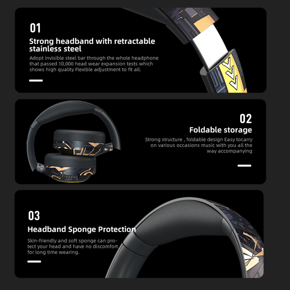 --The earphone design that fits the human auricle makes it more firm and comfortable to wear--foldable design and adjustable length hinge, easy to carry.--Bluetooth-compatible 5.0 upgrade chip: more stable transmission, easier connection, lower power consumption, and more powerful performance--no delay: show a better gaming experience without affecting operation--it can not only listen to music and play games, but also can be used as a mobile phone stand.