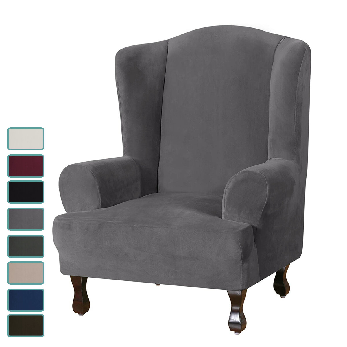 Color: Khaki / Grey / Red / Navy / Brown / White / Black / Dark GreyFabric Type: 85% Polyester + 15% Spandex Velvet Plush MaterialPerfect For: Cloth and Leather Standard Wing ChairsHighlight: Fit both T cushion and Box cushion wingback chairsMaterial Care Instructions: Do Not Bleach, Tumble Dry