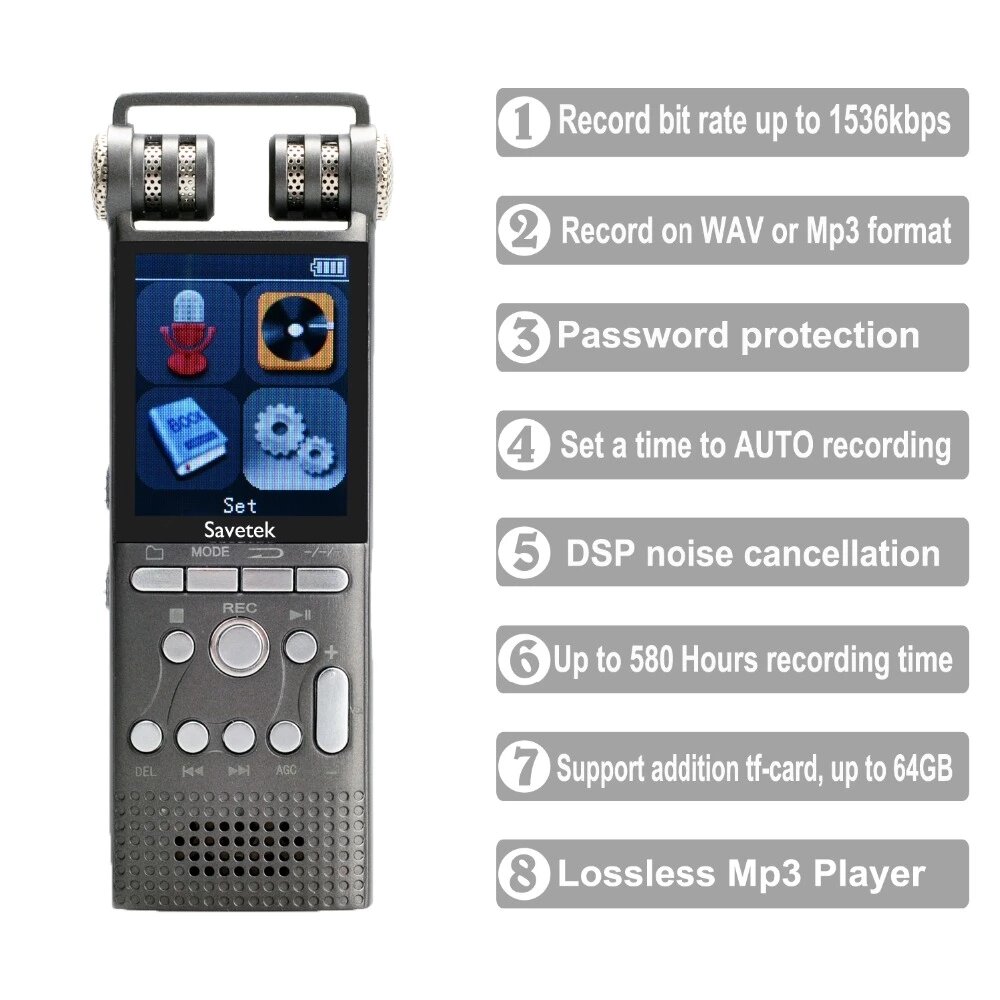 Rechargeable Batterie (800 mah), continue e enregistrer plus de 100 heures (format Mp3)