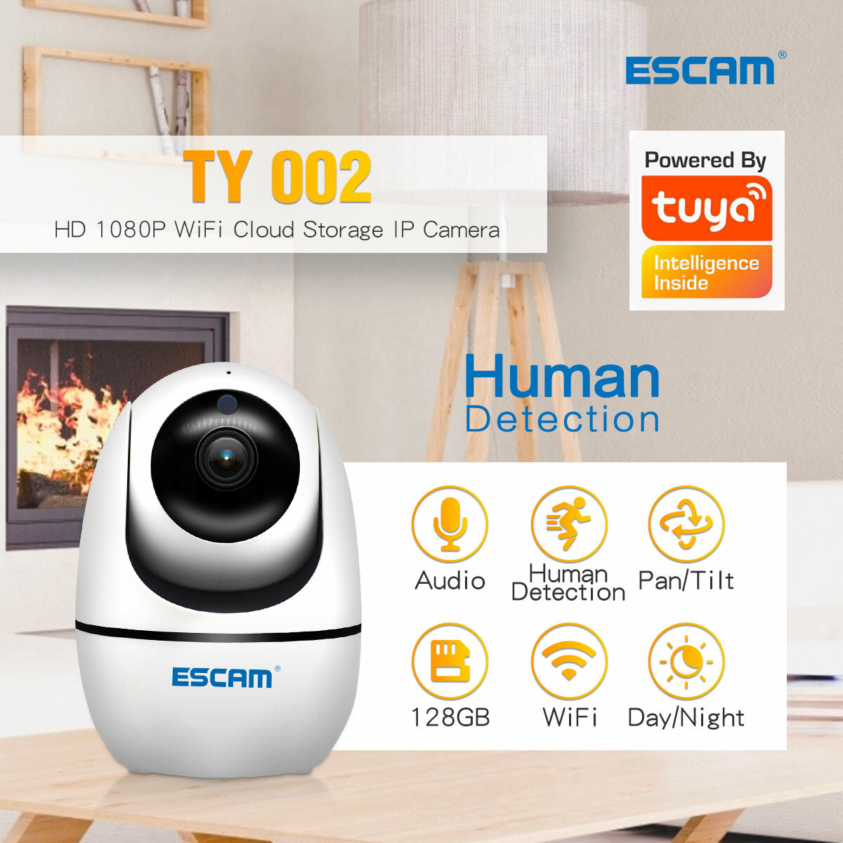 ESCAM TY002 HD 1080P WiFi stockage en nuage camera IP detection de mouvement humanoede interphone sans fil PT camera IP moniteur bebe – Prise AU