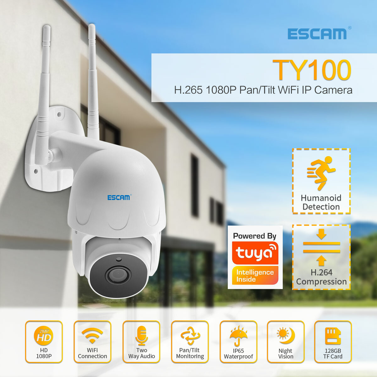 ESCAM TY100 Tuya H.265 camera IP WiFi 1080P panoramique / inclinaison exterieure Audio bidirectionnelle alarme vocale Wifi camera etanche Vision nocturne Surveillance – Prise americaine