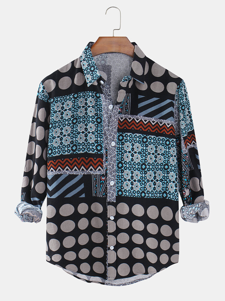Ethnic Style Print Patchwork Lapel Collar Long Sleeve Vintage Shirts – Black S
