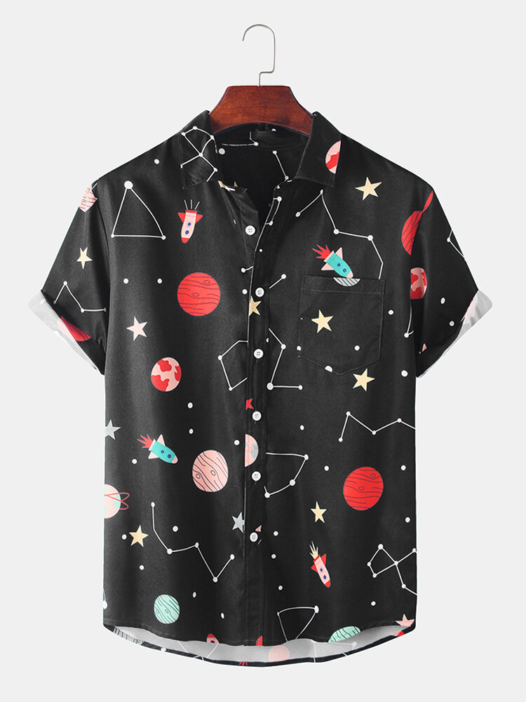 Fashion Starry Sky Cartoon Printing Breathable Short Sleeve Casual Shirts For Men Women – Cyan 2XL