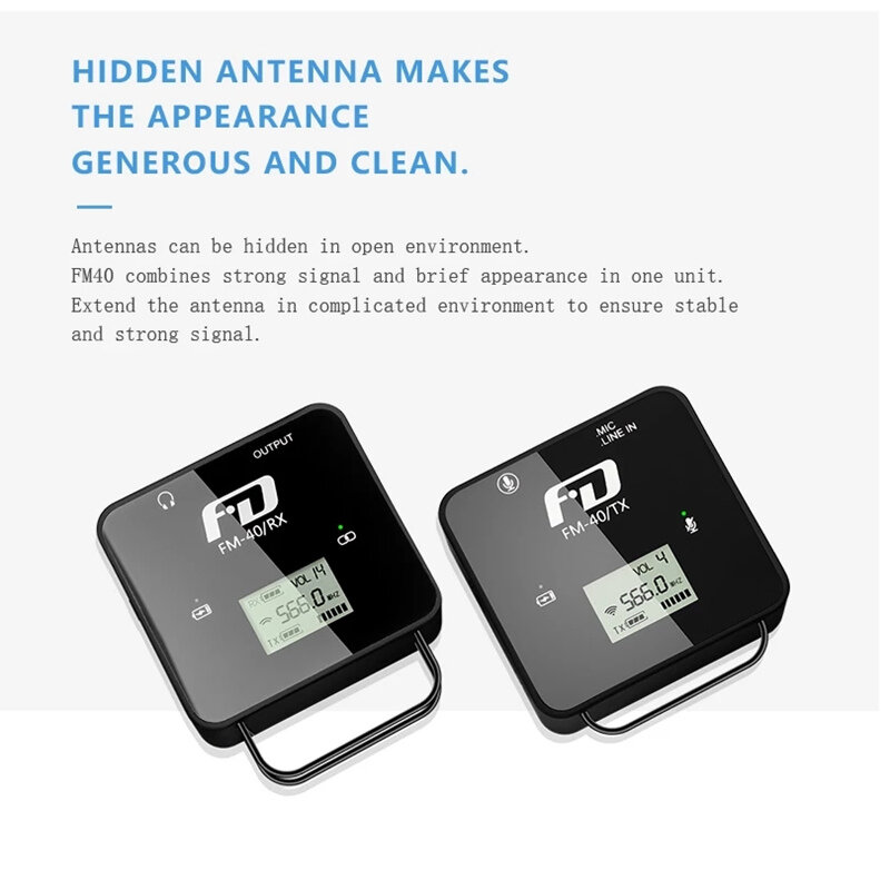 . Caracteristiques: -Avec une taille au niveau de la paume de 4 cm et un poids au niveau de la plume de 38 grammes. -Le signal FM40 reste stable. -Le FM40 a une batterie integree qui est chargee avec une interface TYPE-C, et il a une autonomie complete d'environ 4 heures lorsqu'il est completement charge. -L'emetteur du FM40 est un microphone sans fil directionnel capacitif avec un puissant clip cravate, avec une sensibilite de -33DB. -Le recepteur du FM40 est livre avec une surveillance casque 3,5 mm et une camera 3,5 mm, un ordinateur, une camera video et une autre entree de signal multi-peripherique. Caracteristiques: Nom d'article: Microphone Lavalier Materiel: ABS, metal Modele: FM40 Gamme de frequences: 566-594 Type sans fil: UHF Directionnel: omnidirectionnel Sensibilite: -33DB Entree: TRS 3,5 mm pour microphone Lavalier et entree audio externe Sortie: 3,5 mmTRS (camera) + 3,5 mmTRS (surveillance des ecouteurs) Distance de travail: 30m e 80m (environnement ouvert) Autonomie de la batterie: TX-3,5 heures, RX-5 heures Batterie Type: 800mAh integre Batterie (inclus) Port de charge: Type-C Tension de charge: DC-5V Gain d'antenne sans fil: 18dbm Quantite de canal: 57 Temperature de stockage: -25 degres Celsius e 45 degres Celsius Temperature de travail: -10 degres Celsius e 45 degres Celsius Caracteristiques: Universel, Portable, Sans Fil, Durable Sans la taille du clip arriere: 42,5 mm x 45,2 mm x 17,2 mm / 1,67 "x 1,78" x 0,68 "(environ) Le forfait comprend: 1 x emetteur 1 x recepteur 1 x pochette de rangement 1 x cordon d'alimentation USB 1 x ligne TRS-TRS 1 x ligne TRS-TRRS 1 x microphone Lavalier 1 x laniere