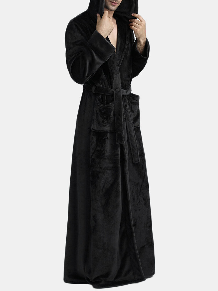 Name: ChArmkpRSleeve Length: Long SleeveItem Type: SleepwearPattern Type: Solid ColorGender: MenFit Type: LooseStyle: CasualThickness: RegularDesign: Hooded, BeltSeason: Spring, Autumn, WinterMaterial: FlannelColor: Black, Dark Blue, Beige, RedCuff Type: Shirt SleevesOccasion: Leisure